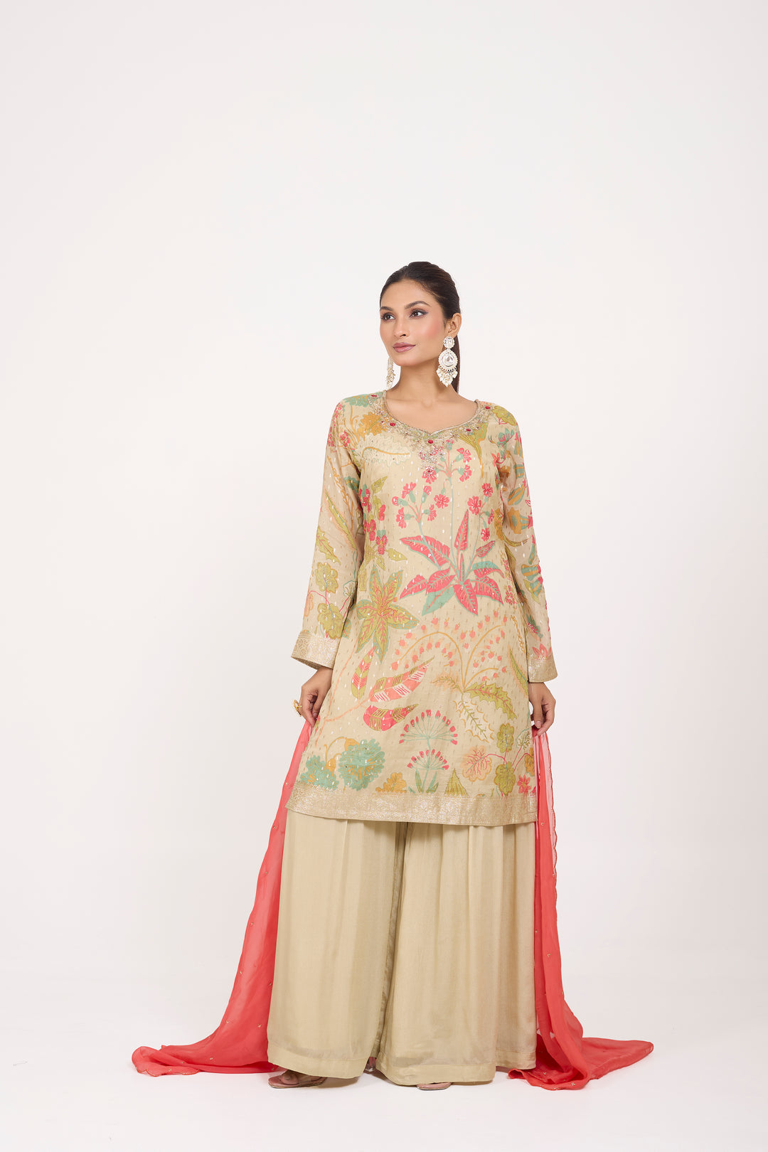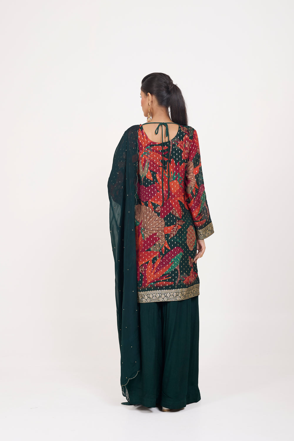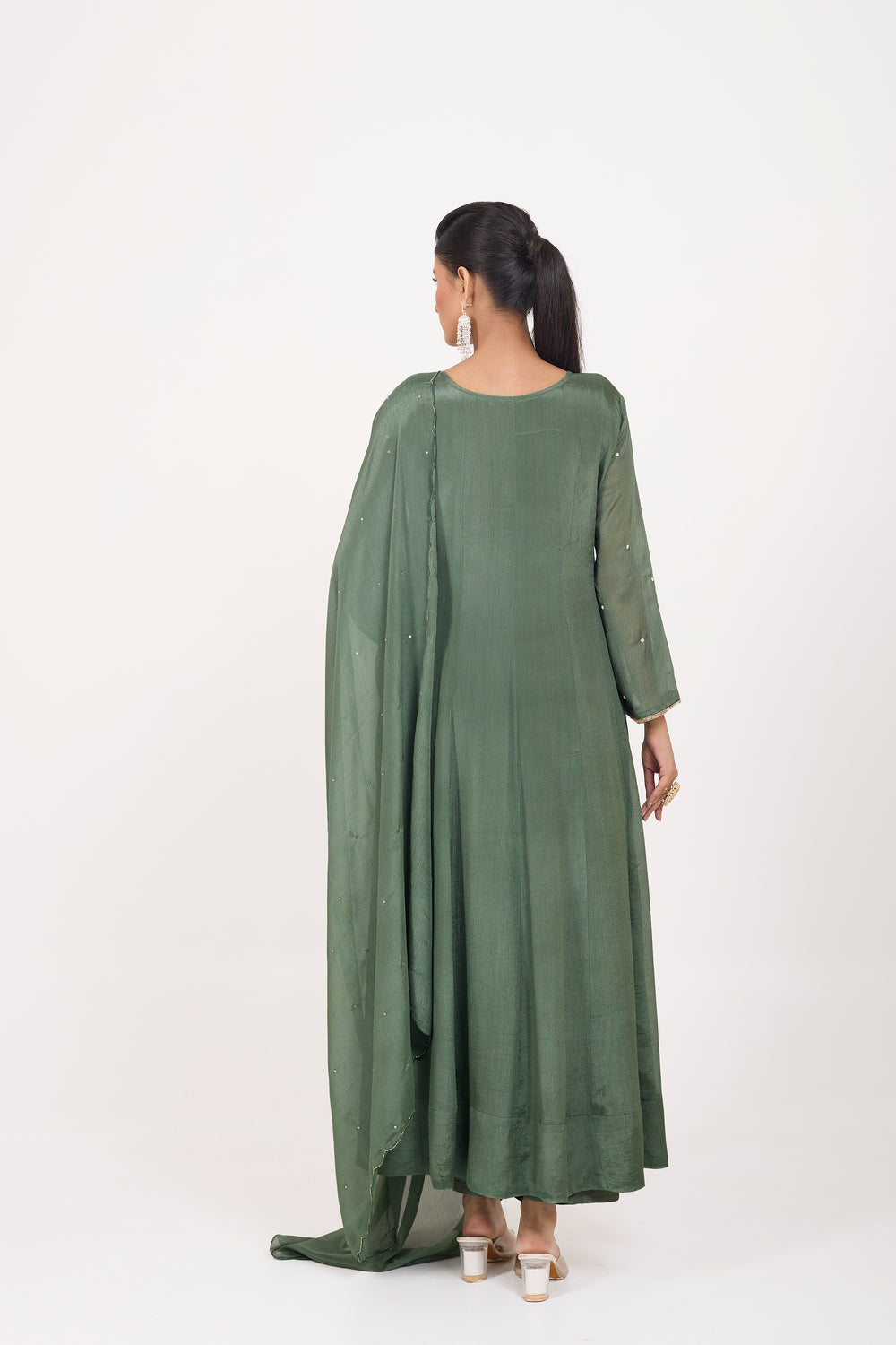 Floral Printed Kurta & Pant - Hand Embroidered - Set of 2 - Green - Muslin Silk