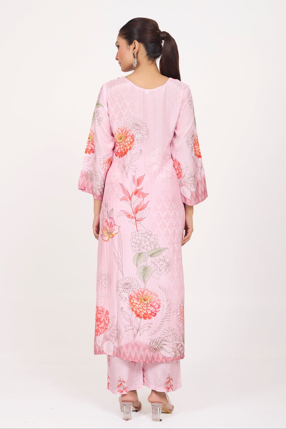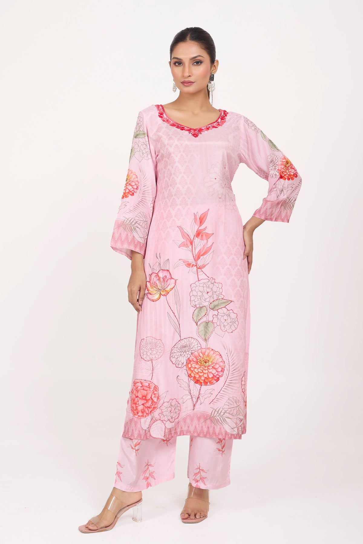 Printed Kurta & Pant - Hand Embroidered - Set of 2 - Pink - Muslin Silk