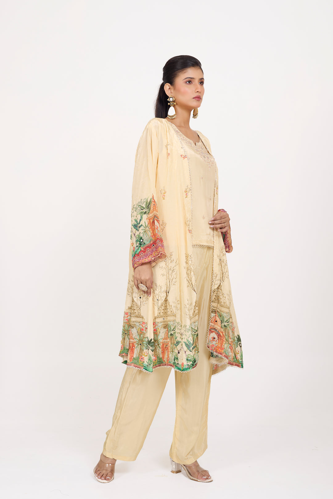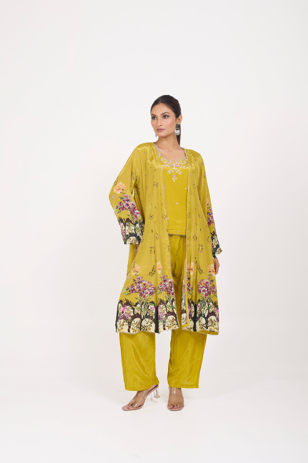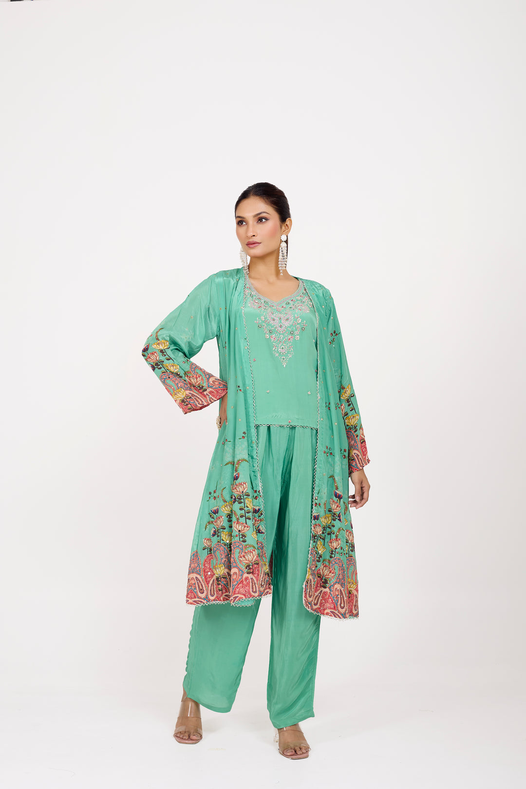 Floral Printed Kurta & Pant - Hand Embroidered - Set of 2 - Green - Muslin Silk