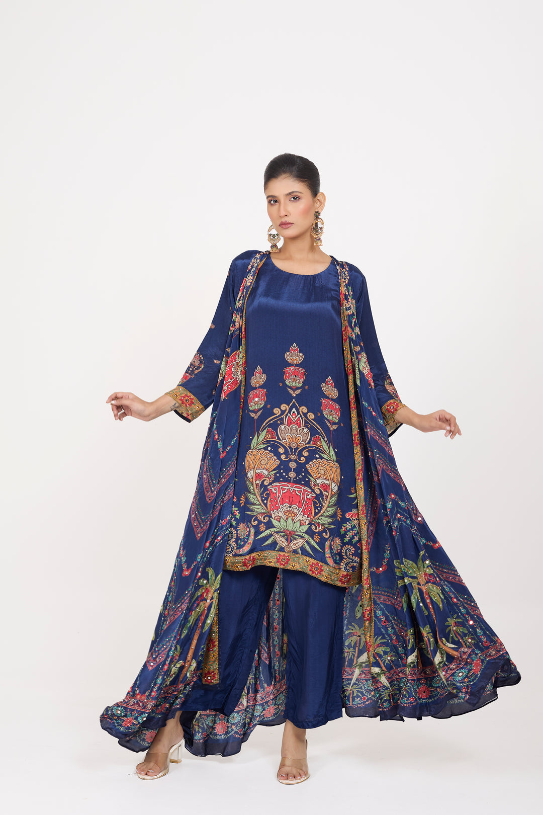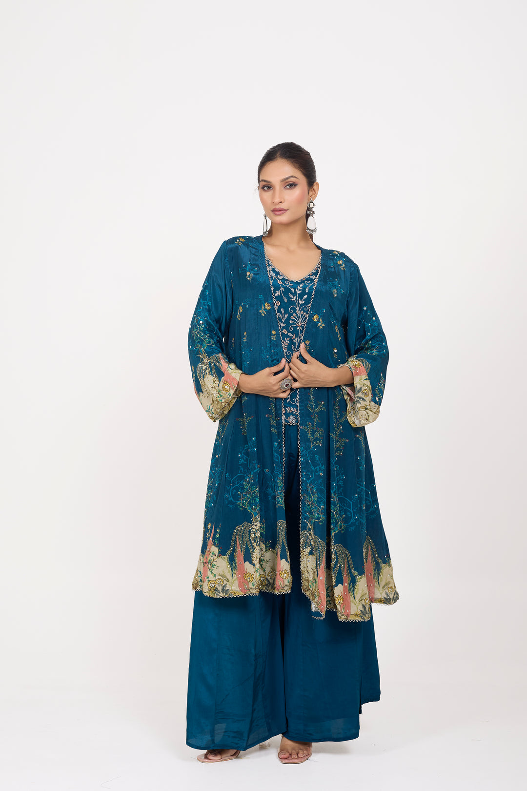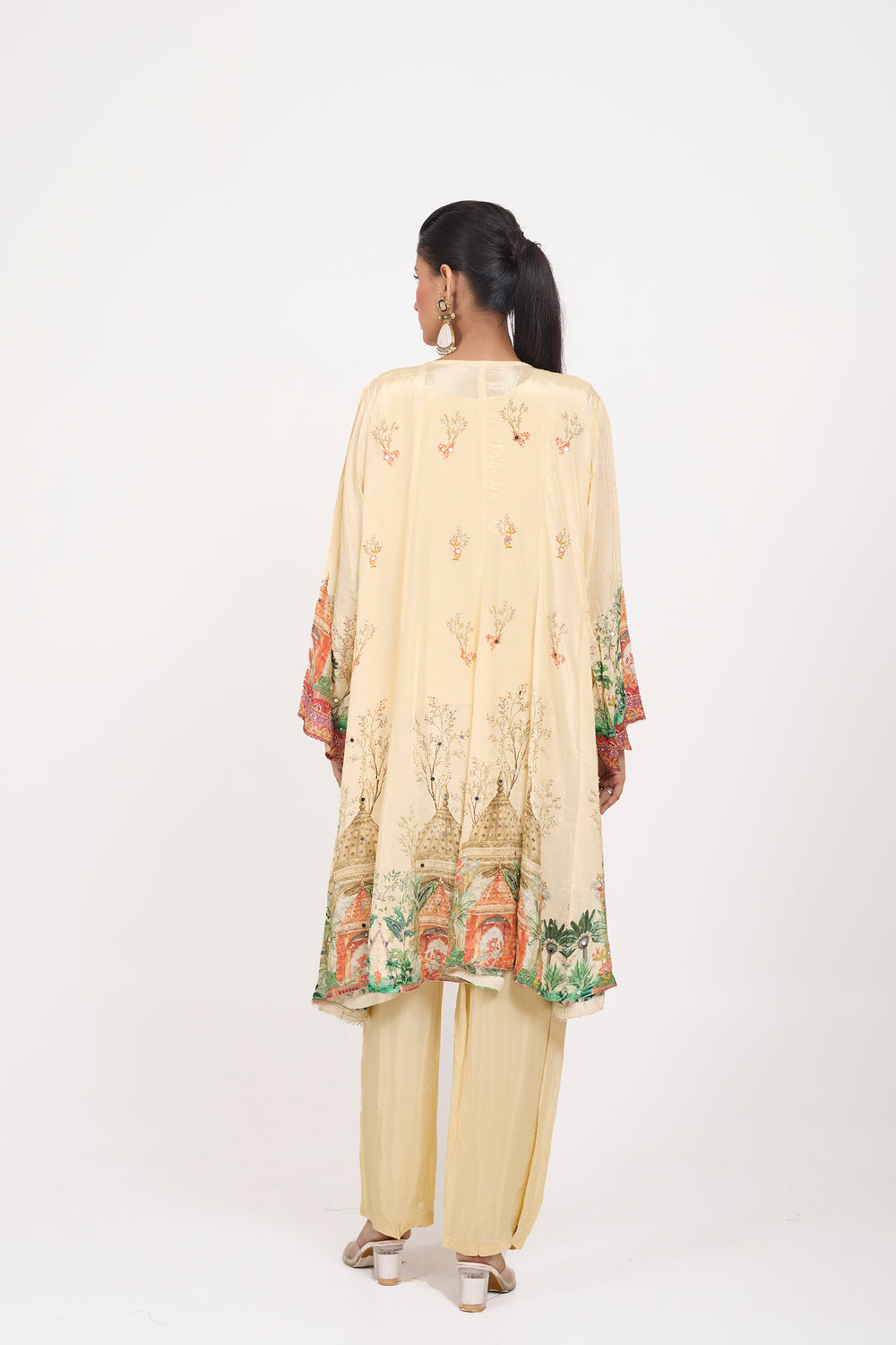 Floral Printed Kurta & Pant - Hand Embroidered - Set of 2 - Green - Muslin Silk