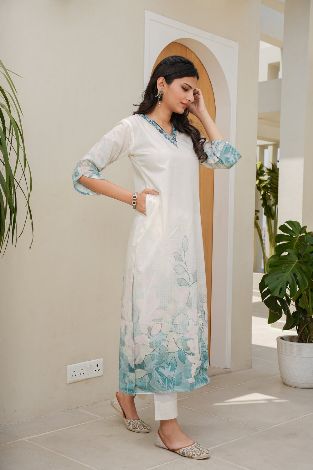 FLORAL PRINTED COTTON KURTA & PANT - HAND EMBROIDERED - SET OF 2 - OFF WHITE