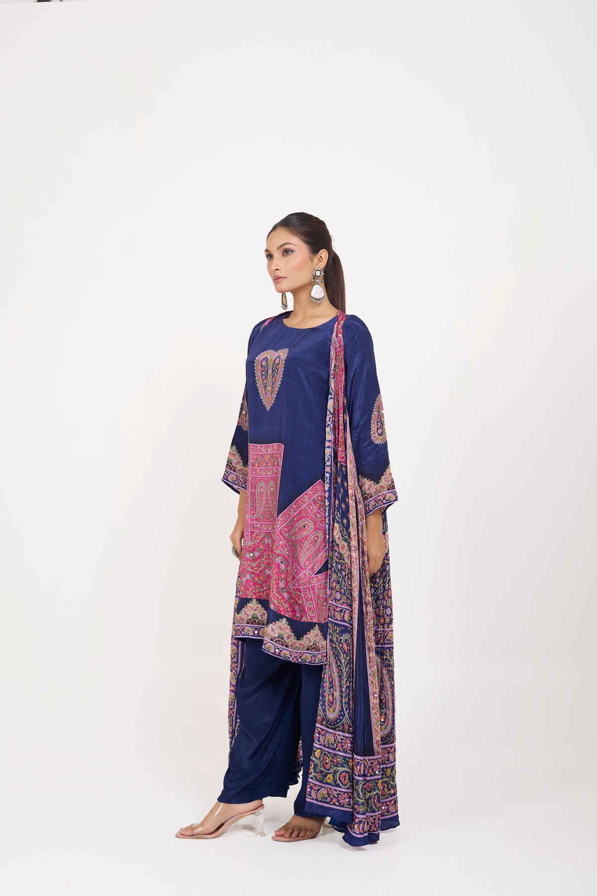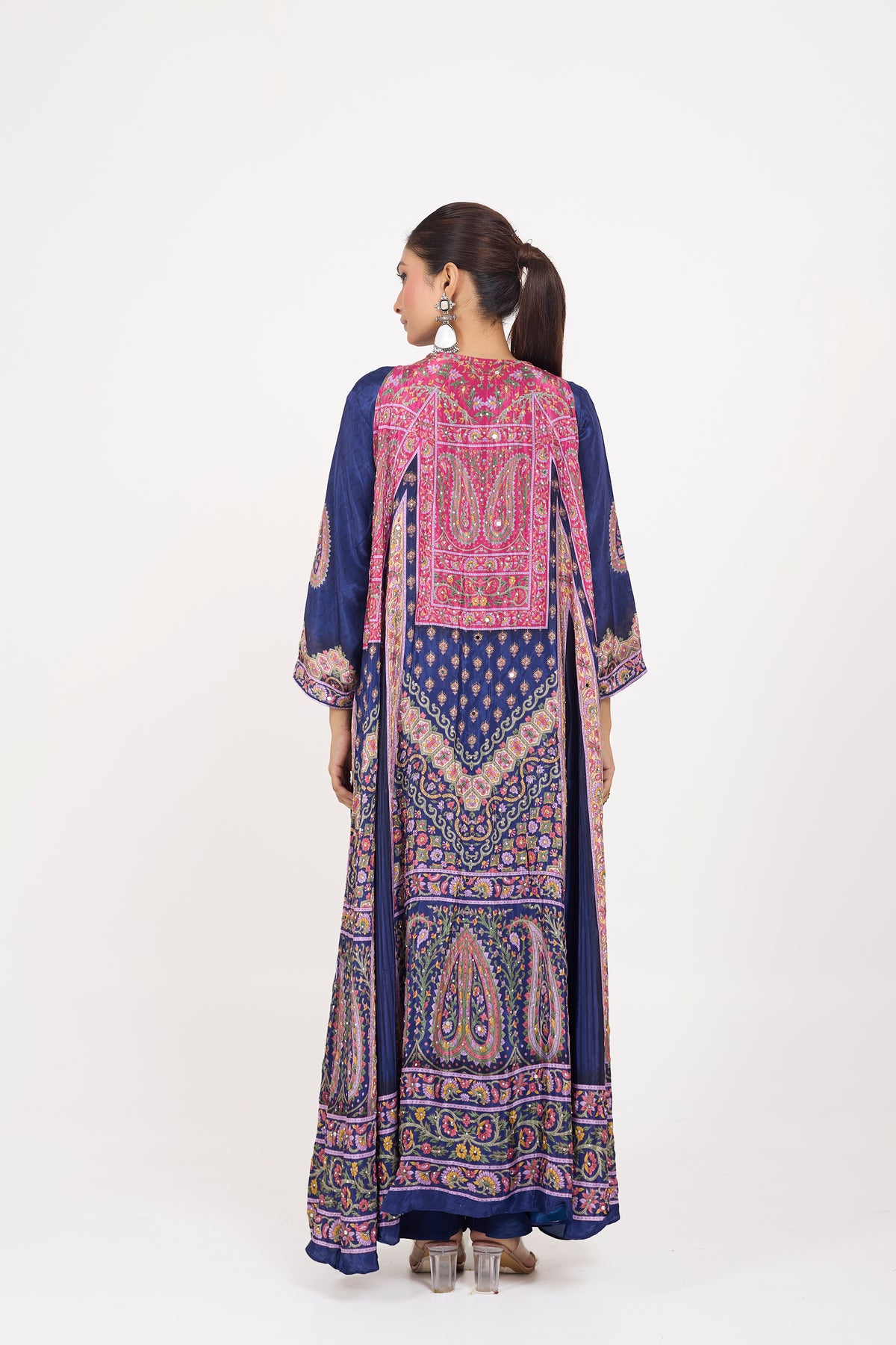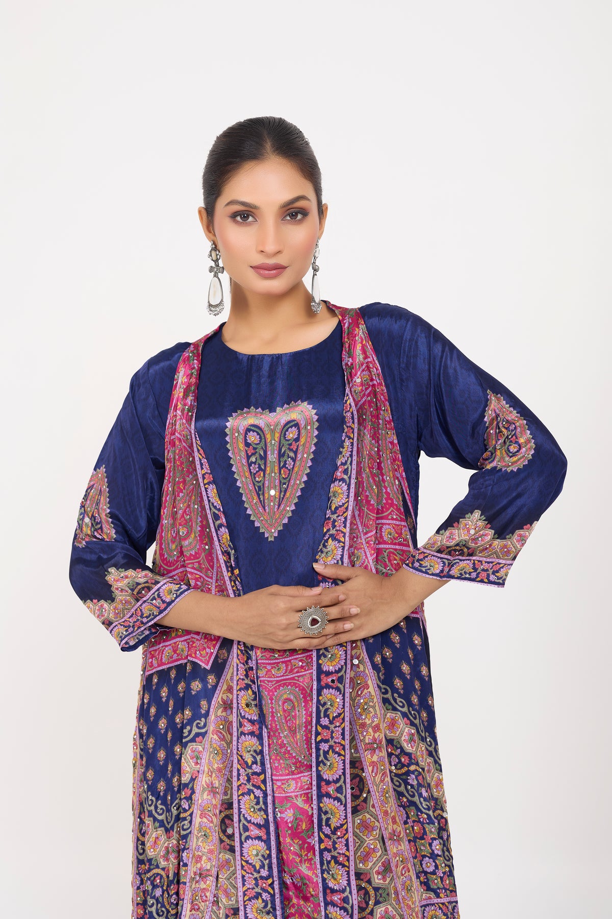 Indo-Western Printed Shrug Set - Hand Embroidered - Set of 3 - Dark Blue