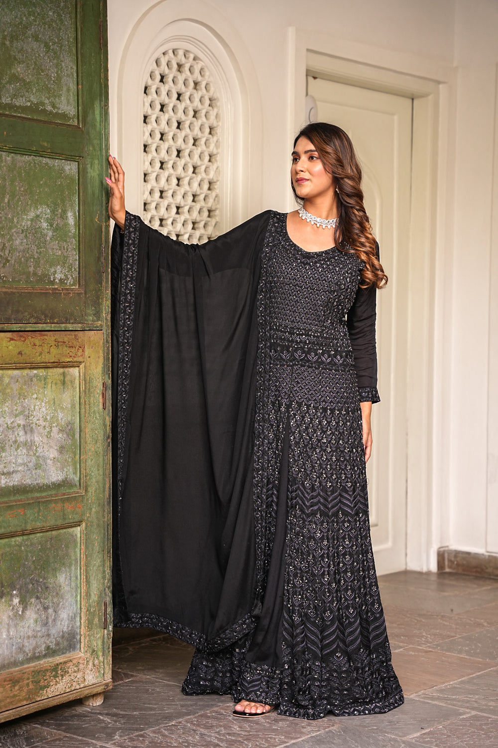 BLACK INDO-WESTERN FRONT SLIT GOWN FOR WOMEN- PAIRED WITH LEHENGA & DUPATTA - EMBROIDERED WITH RESHAM & HANDWORK - SET OF 3